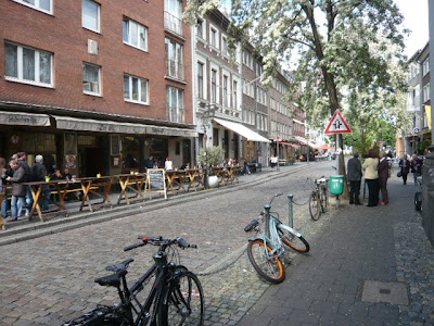 Natürlich kann man hier auch Wasser trinken. Natürlich gibt es hier auch Pils. Aus Flaschen. Aber Alt geht schneller. Rufen, Gucken, Trinken, Gucken. Und Grüßen, vor allem Grüßen. Die Ratinger Strasse ist erst einmal nicht anders als all die anderen Straßen in der Düsseldorfer Altstadt auch. Hier gibt es fast in jedem Haus eine Kneipe, falsch, die Häuser sind Kneipen. Aber vor allem gibt es hier im Sommer, aber auch zu jeder anderen erträglichen Temperatur, spontane Menschenaufläufe...